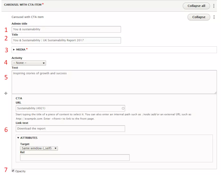 The media Carousel with CTA allows to add a list of Carousel with CTA items. Below the details of fields for a Carousel with CTA item.