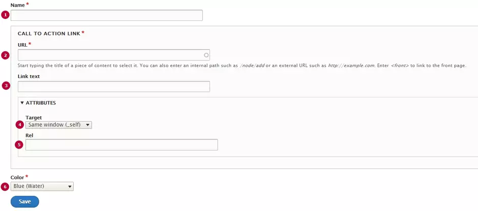 | 3 - Link text | Label for the button. Node's title will be displayed as label, if no link text is set for internal link |