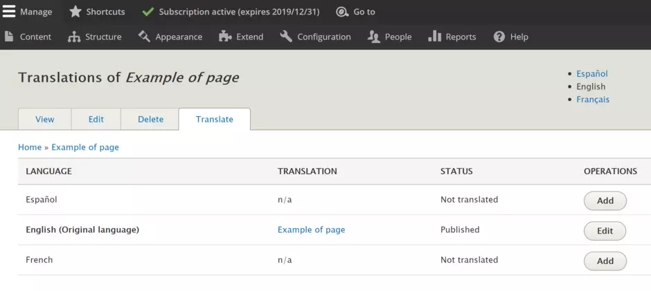 Please note, the languages available are the ones set for the site in the config. You are not able to add a new language in this interface