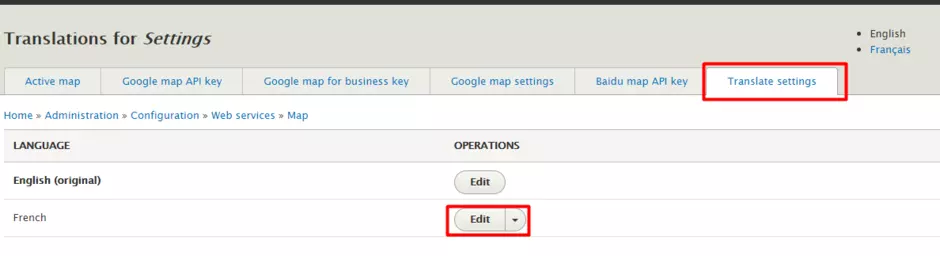 3. Click on Translating settings tab, chose the translation you want to add / edit and click on the Edit button.